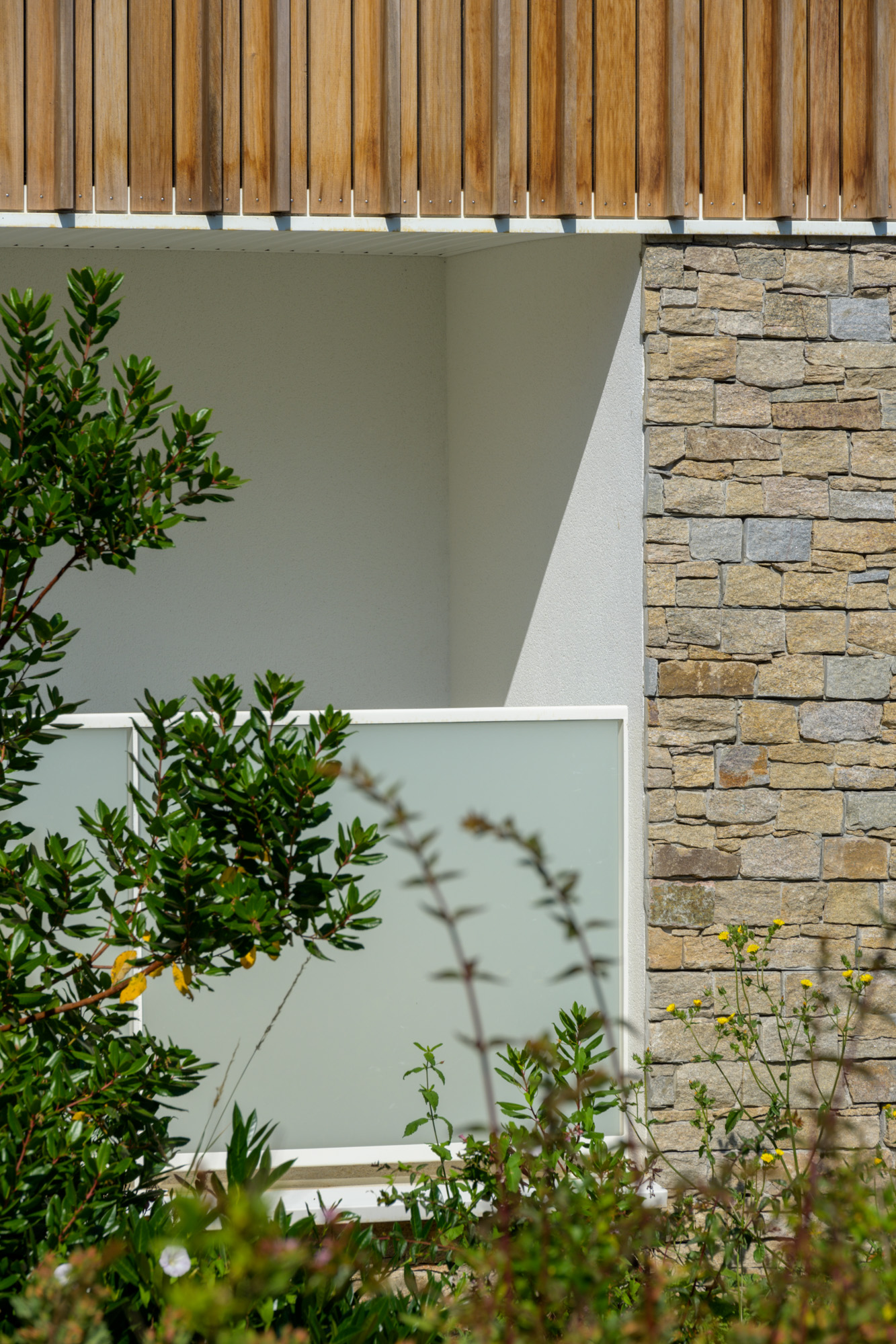 Jardin du Golfe opte pour un style architectural simple et épuré, misant sur des matériaux naturels et pérennes à l’image des façades en bois, des revêtements gris clair ou blanc et des garde-corps et pare-vues en verre opalescent. Une simplicité qui se combine à la perfection avec le paysage environnant : arbres à hautes tiges, arbustes caducs, plantes basses et essences typiques de la région cohabitent dans une symbiose naturelle.
